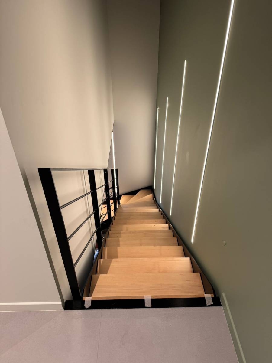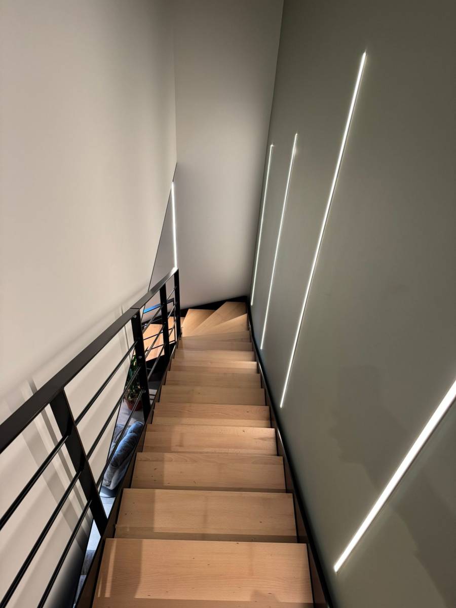 L’escalier est sublimé par un éclairage LED intégré dans le mur, créant un jeu de lumière vertical élégant qui met en valeur chaque détail de la structure. Cet éclairage indirect apporte non seulement une ambiance chaleureuse mais améliore également le confort et la sécurité au quotidien.
