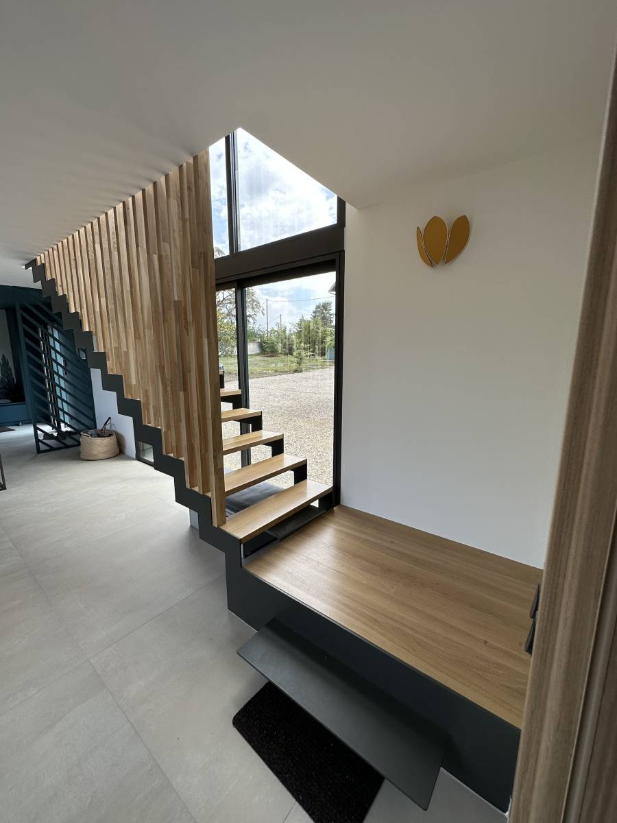 Découvrez notre escalier en acier à limon crémaillère sur mesure, conçu et fabriqué par CreAcier à Charly, dans le département du Rhône (69), à proximité de Lyon. Ce modèle associe parfaitement design contemporain, solidité structurelle et esthétique chaleureuse, idéal pour les intérieurs modernes comme les rénovations de maisons anciennes.