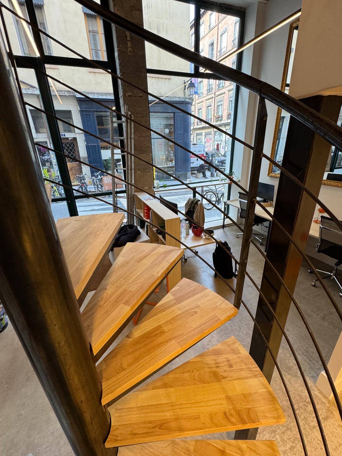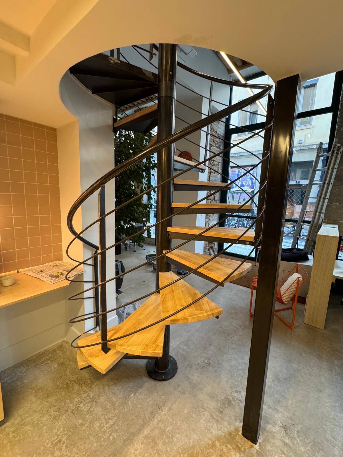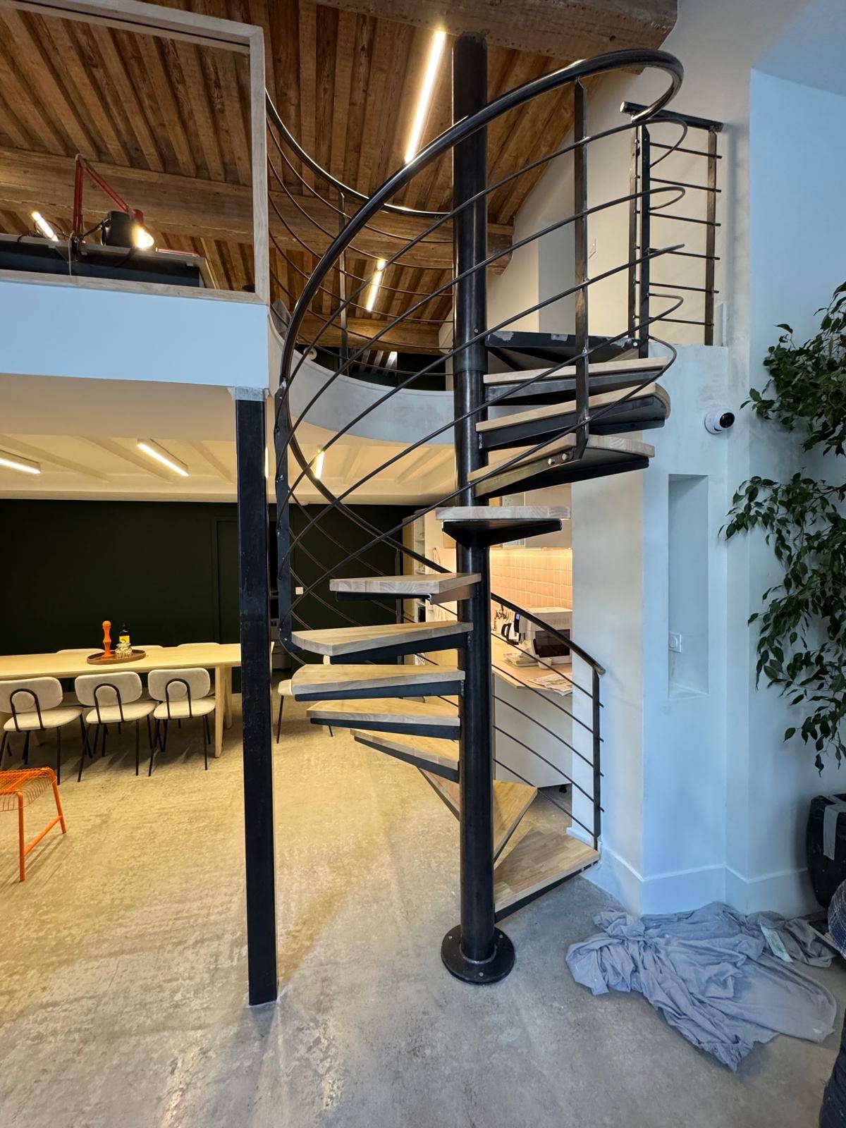 Les marches en bois massif contrastent avec la rigueur du métal, apportant confort visuel et usage quotidien agréable.