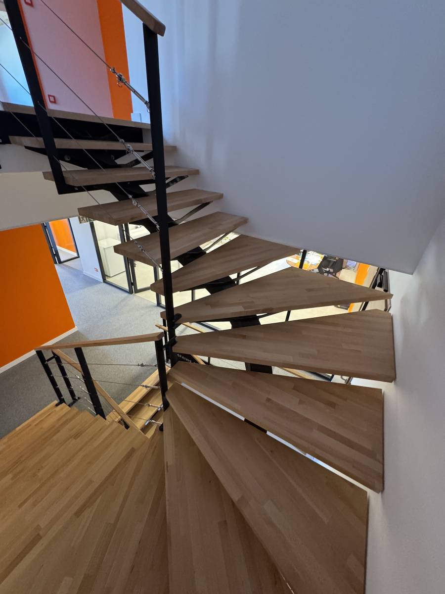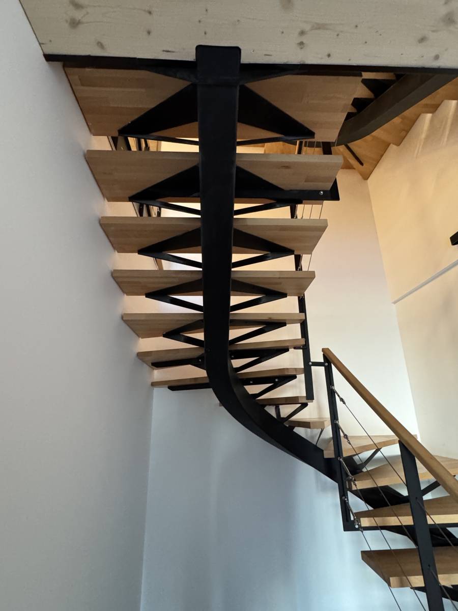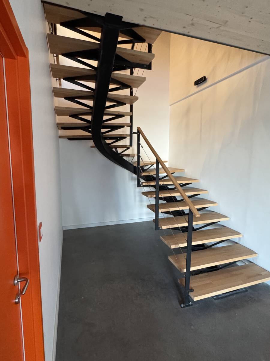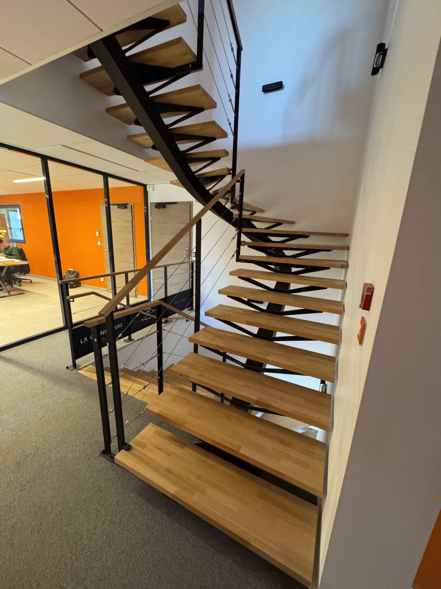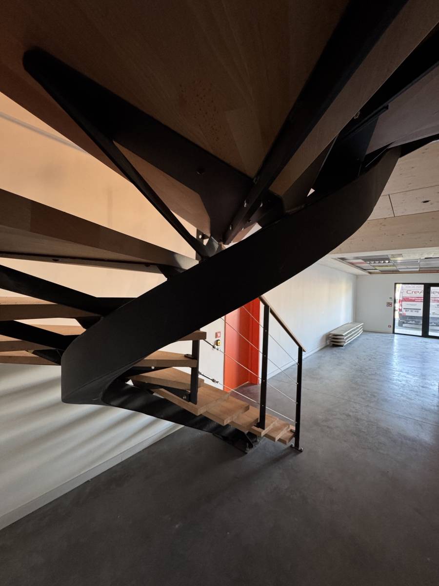 Conçu et fabriqué sur mesure dans notre atelier, cet escalier allie le savoir-faire de la métallerie et la noblesse du bois. Il s’intègre parfaitement dans les intérieurs modernes, ouverts et lumineux, en apportant un véritable caractère architectural.