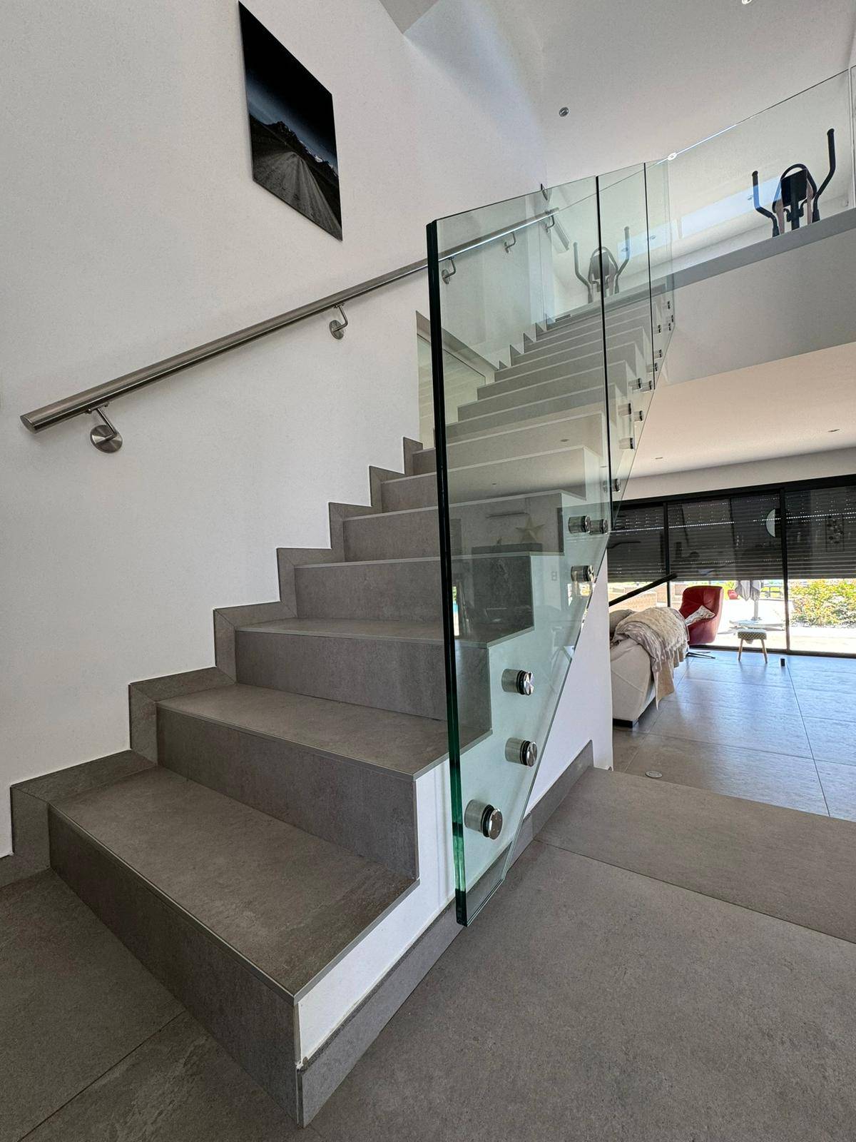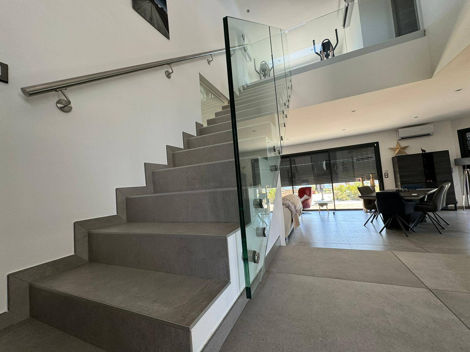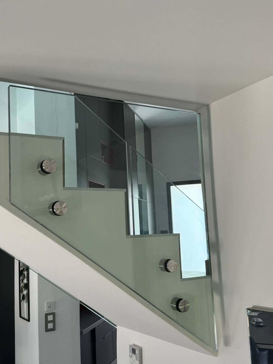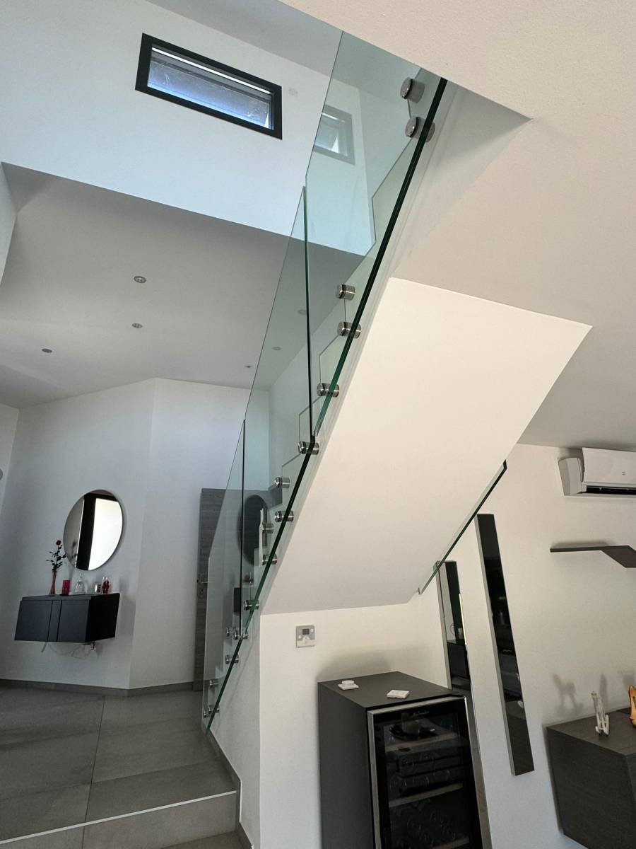 L’ouvrage est composé de vitrages feuilletés trempés clairs, fixés avec un soin millimétré à l’aide de supports inox haut de gamme SADEV. Chaque point d’ancrage a été étudié avec rigueur pour garantir une parfaite intégration et une sécurité optimale, tout en respectant les lignes sobres de l’ensemble.