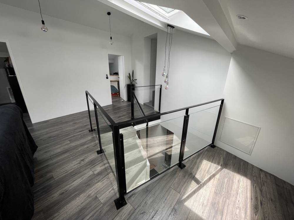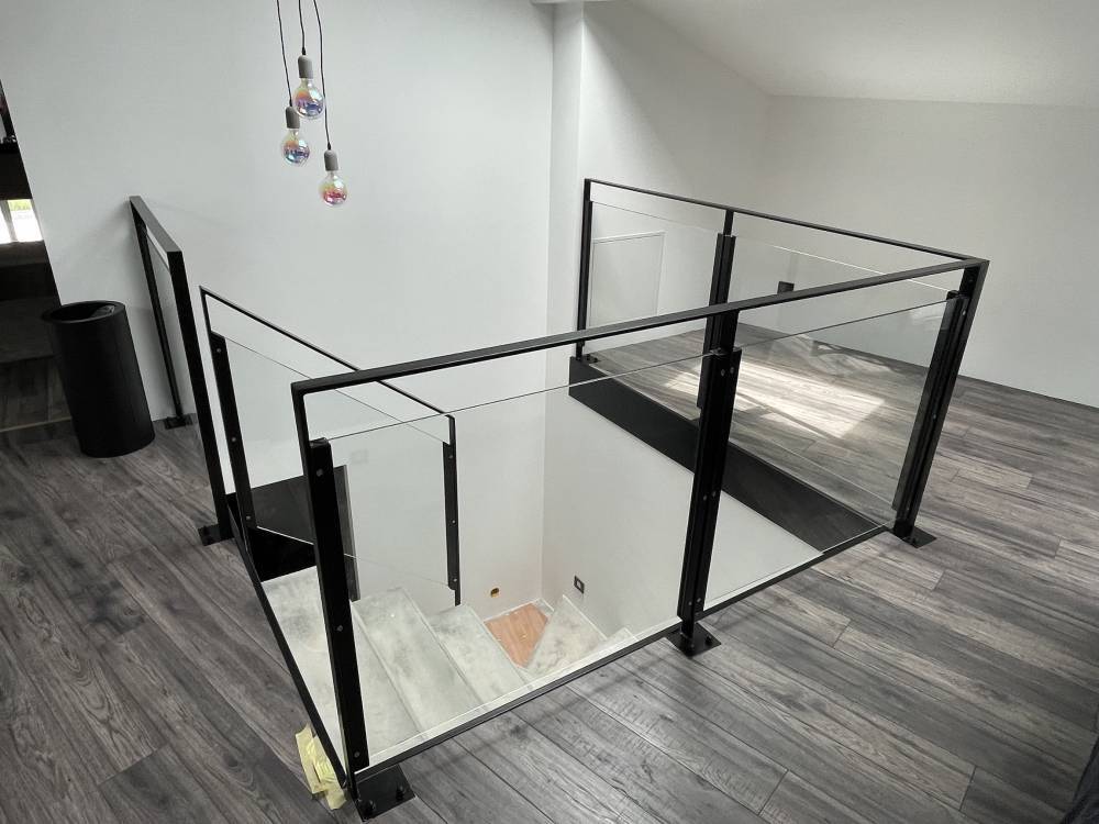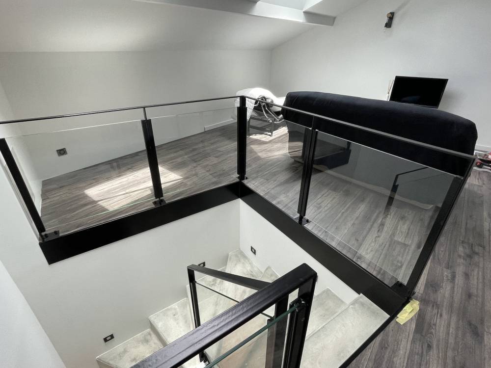 Dans le cadre d'un projet de sécurisation d'une trémie d'escalier en béton à Saint-Chef, notre entreprise spécialisée en métallerie fine a conçu et installé un garde-corps sur mesure alliant acier thermolaqué noir et verre feuilleté.