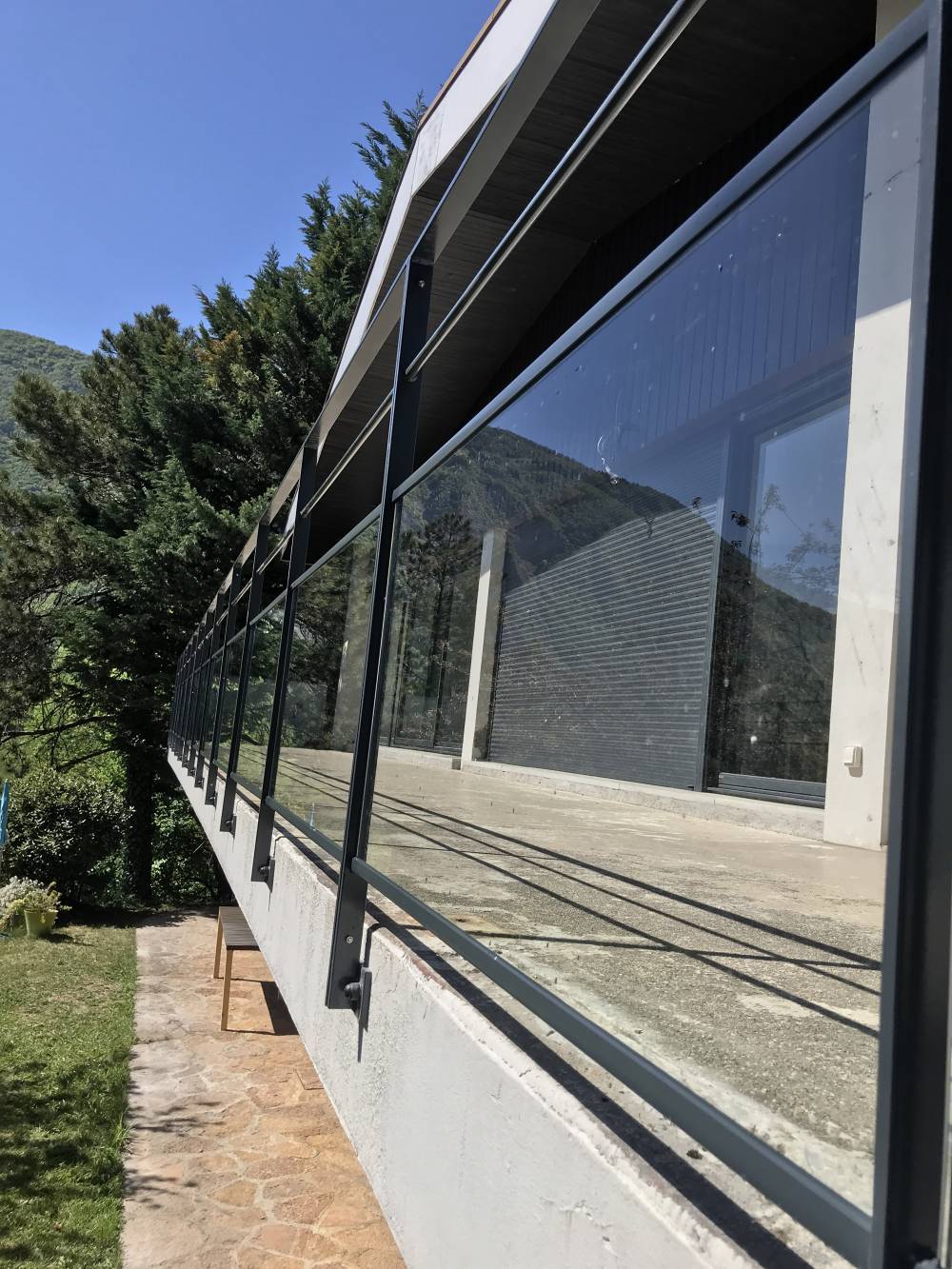 Design : Structure épurée avec montants verticaux et main courante en acier, s'intégrant harmonieusement à l'architecture existante.