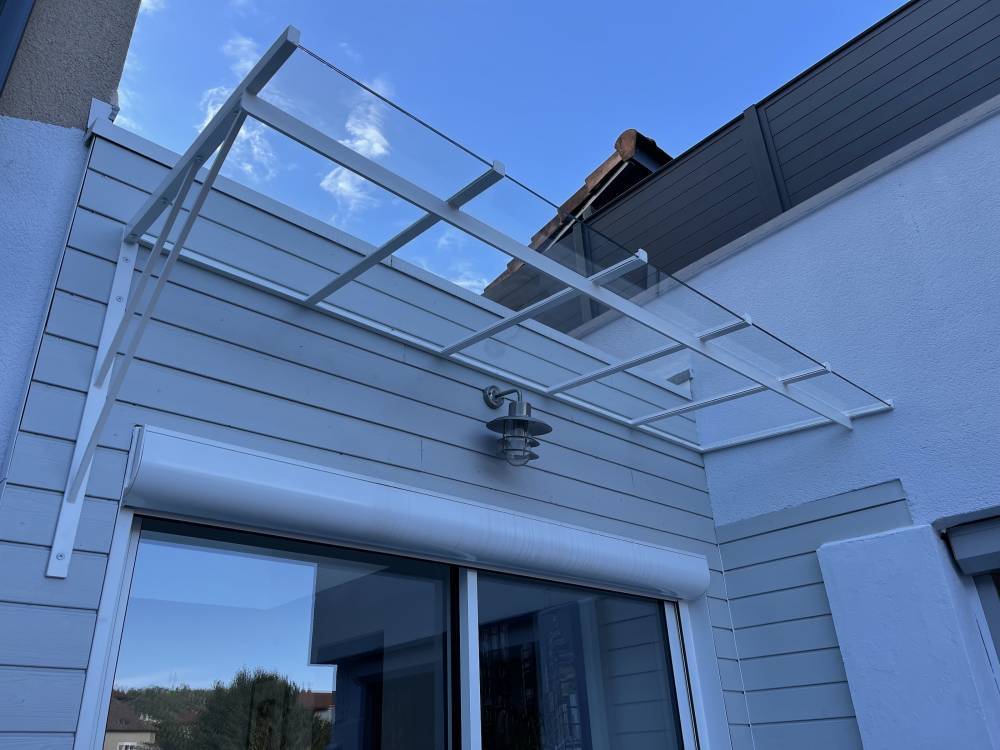 Ici, nous avons une marquise rectangulaire avec 5 vitrages droit et transparents. Le châssis a été thermo laqué au four en RAL 9010 MAT avec 30 % de brillance.