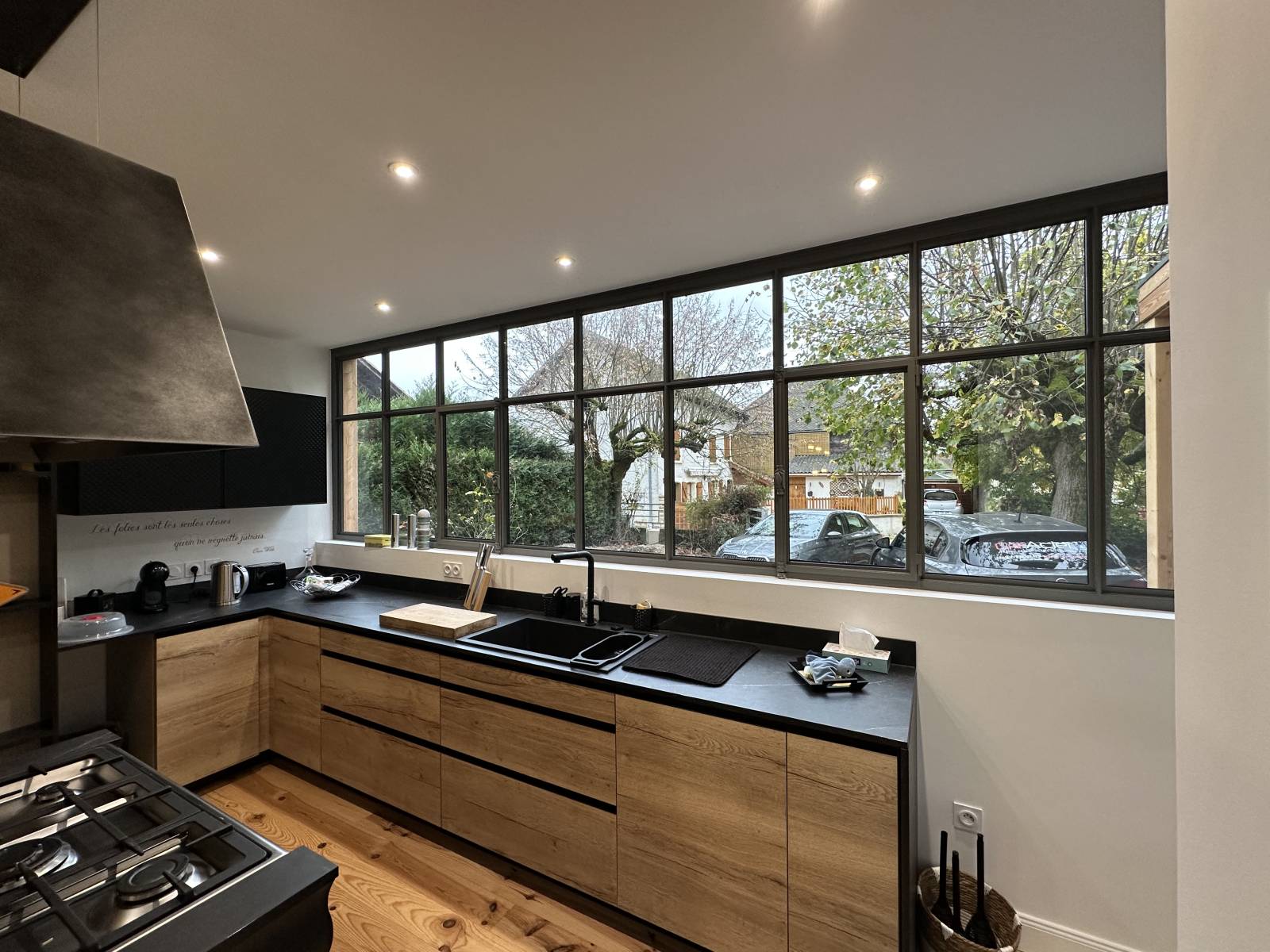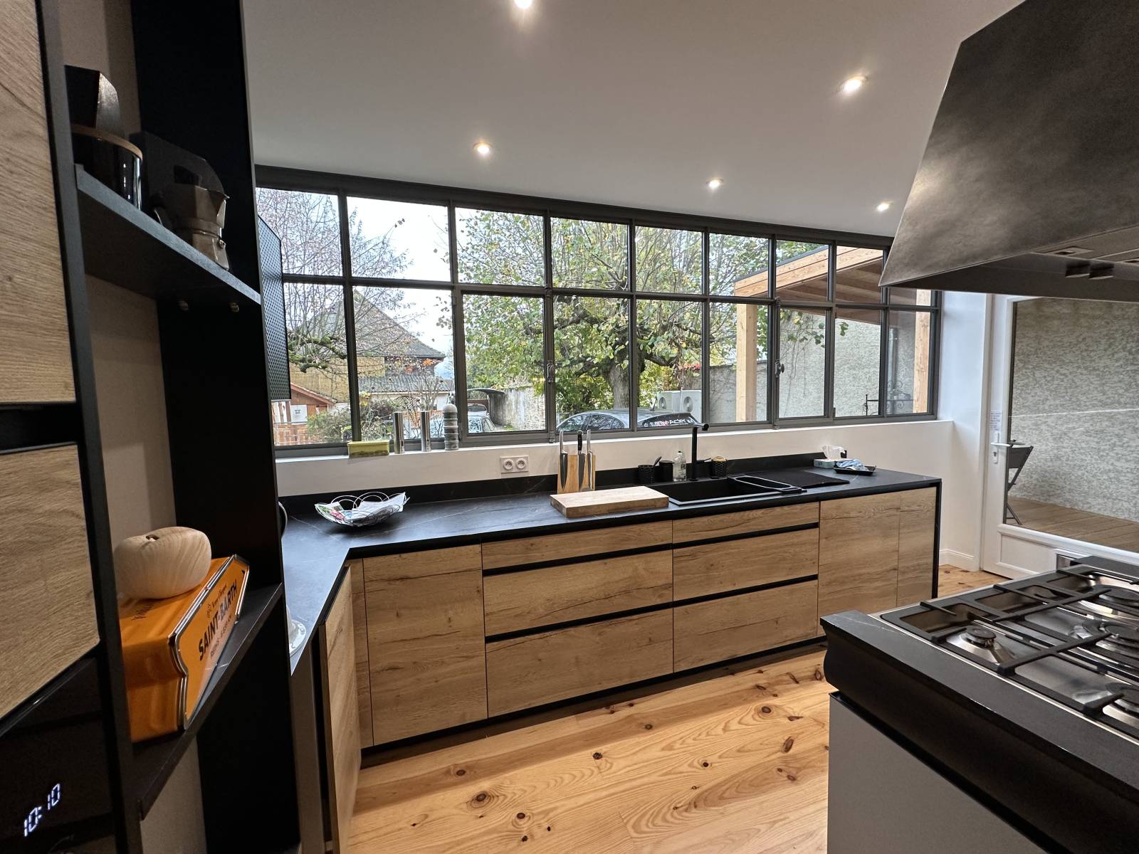 Pour cette maison située à Paladru, nous avons conçu et installé une baie vitrée en acier à rupture de pont thermiquede la gamme Jansen Arte. Cette menuiserie a été intégrée sur une devanture à ossature bois, combinant ainsi la chaleur du bois et la finesse de l'acier pour un rendu contemporain et chaleureux.