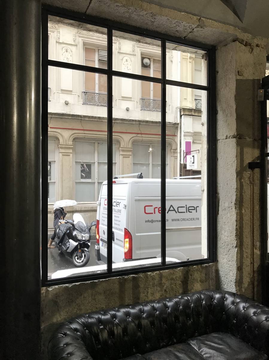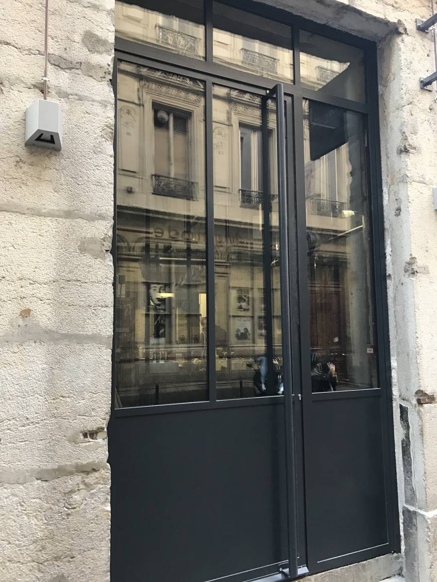 Nous avons ensuite créé sur mesure un ensemble de structures métalliques composé d’une porte et d’un sas d’entrée et de deux menuiseries en acier. Composé de vitrage antieffraction et peinture thermolaqué au four RAL 7016, ces menuiseries acier se marient très bien avec les pierres anciennes de la rue pizay de la ville de Lyon.