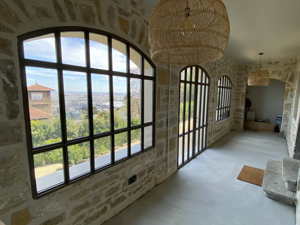 Niveau inférieur : châssis cintrés sur-mesure, parfaitement intégrés à la structure en pierre existante pour un rendu unique.