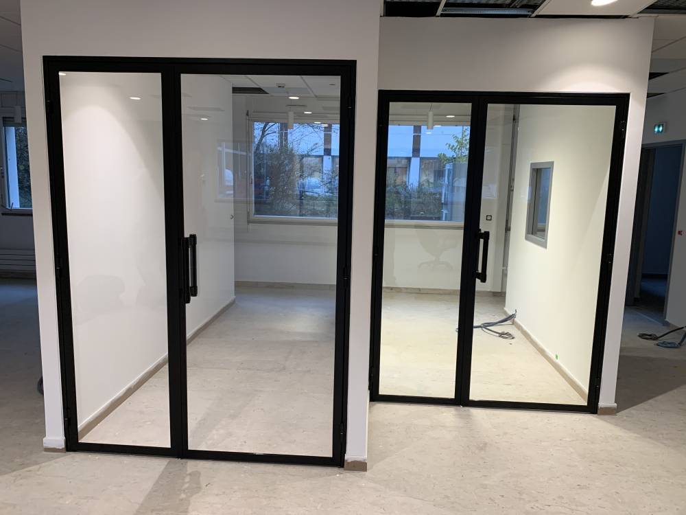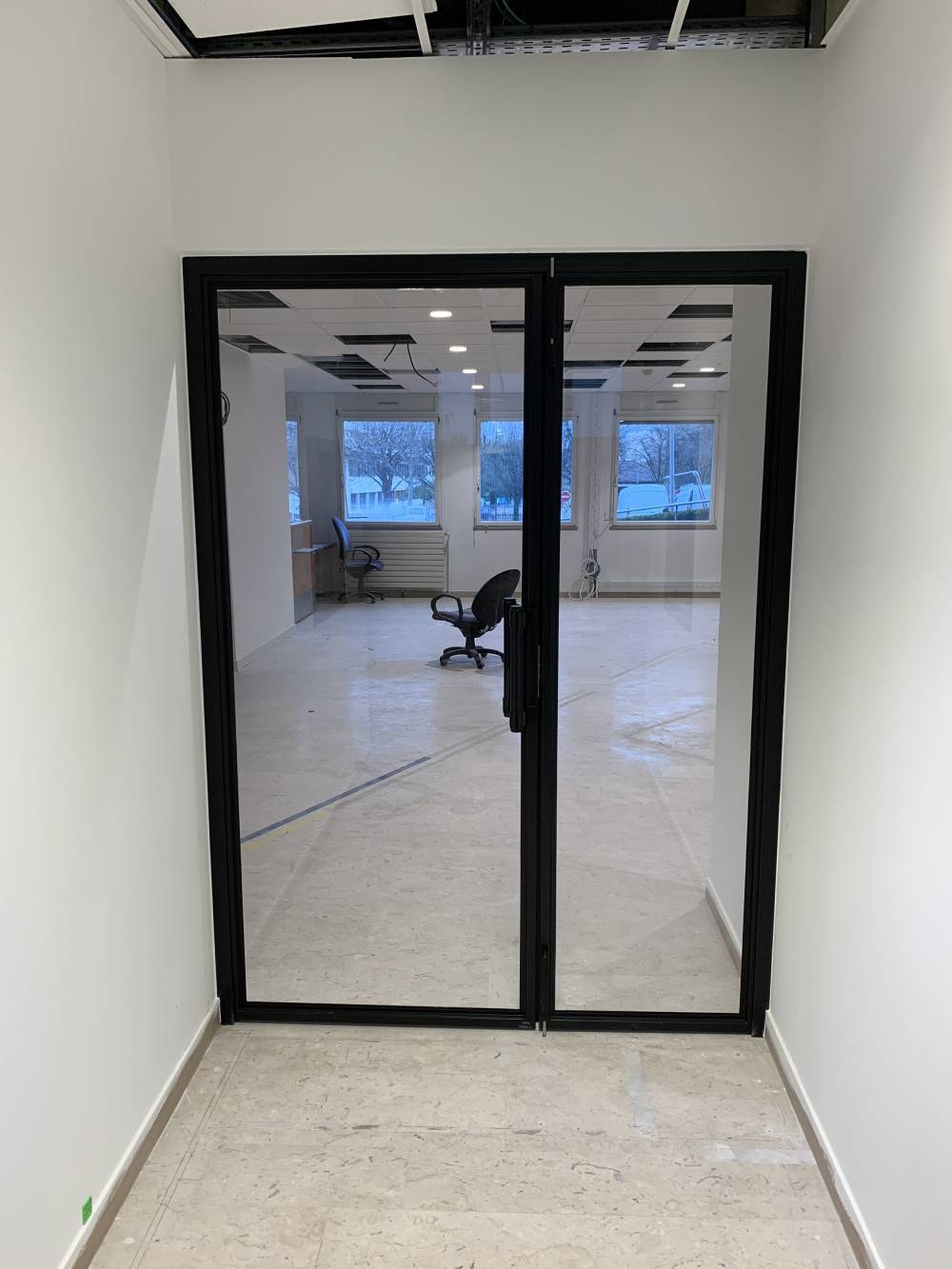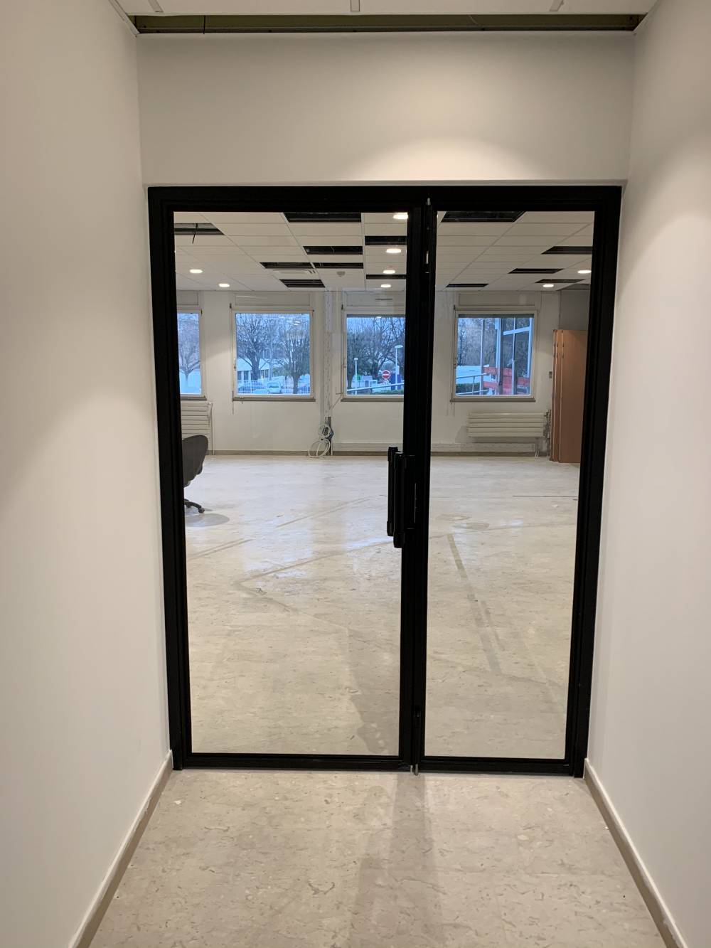 Ensemble de double porte battante en acier. Porte battante avec une partie demi-fixe. La partie semi-fixe vous permet, lorsque vous avez besoin d'avoir un passage plus important pour faire passer vos meubles par exemple. Porte équipée de bâton maréchal de même RAL que le châssis. Porte avec vitrage toute hauteur sans recoupe.