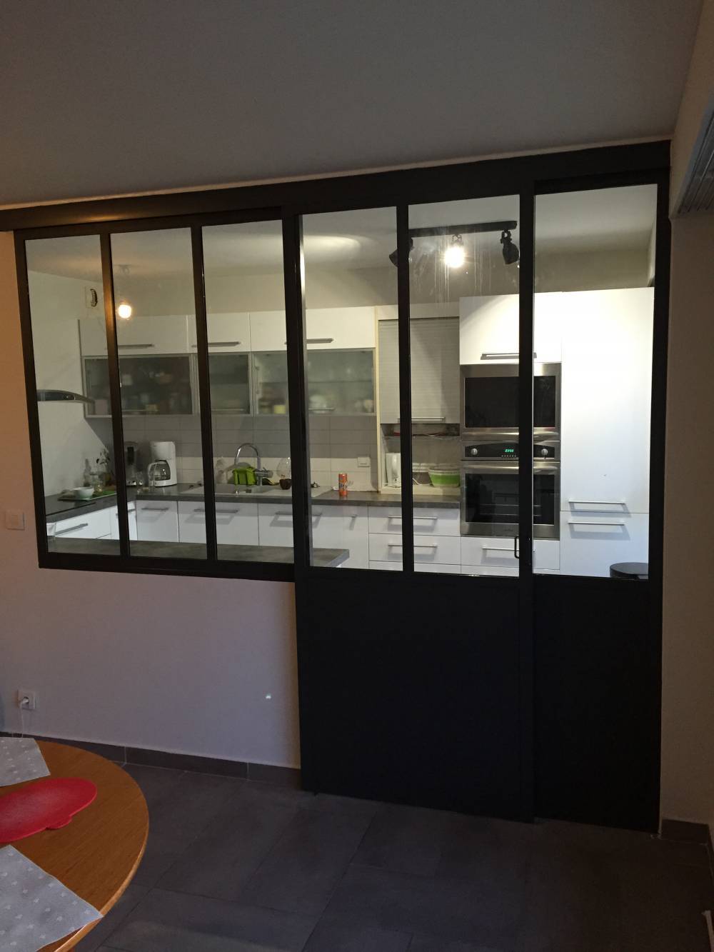 Verrière avec porte coulissante sur mesure La Chapelle de la Tour entre salon et cuisine RAL 9005 (noir) en Isère