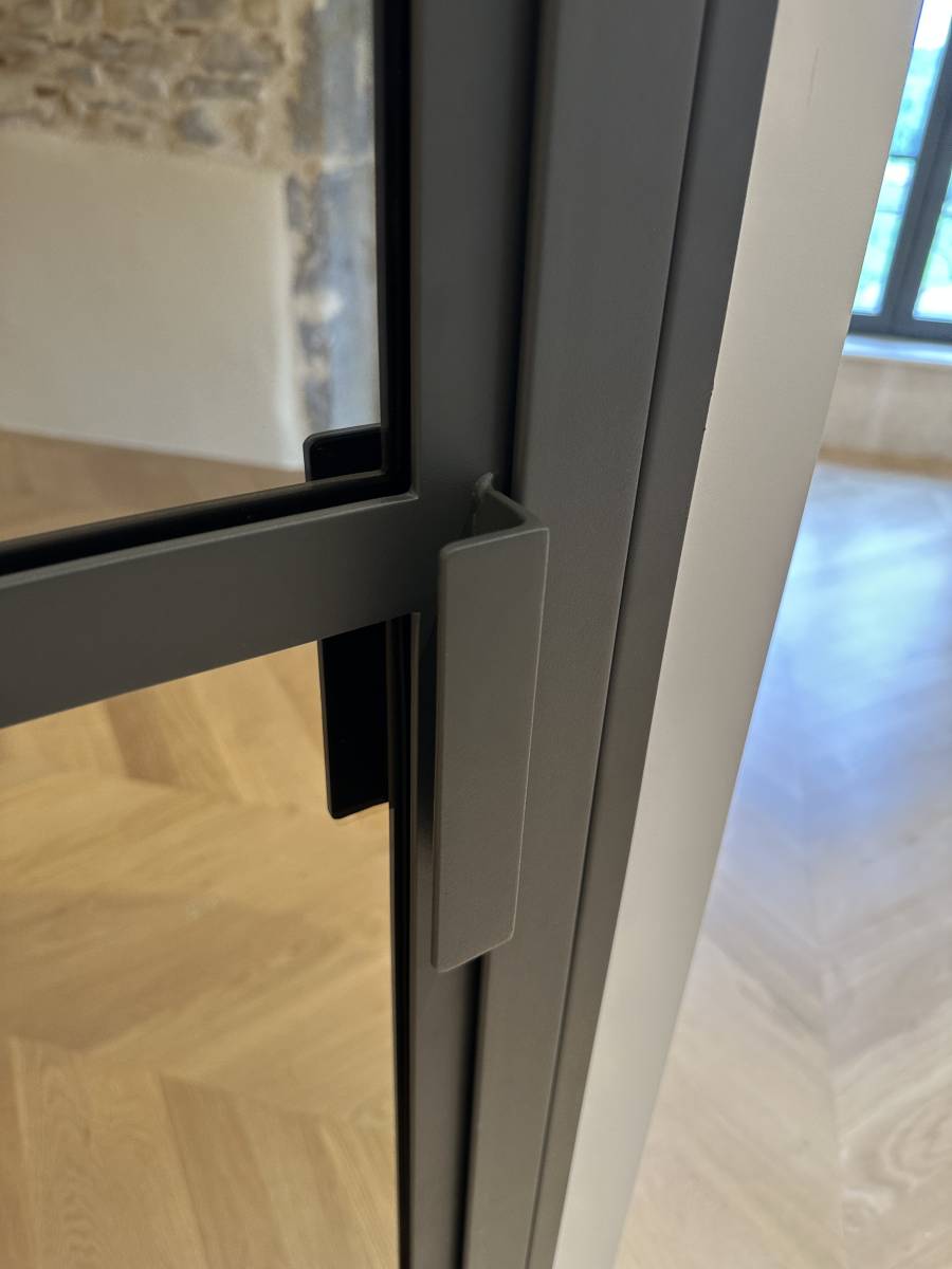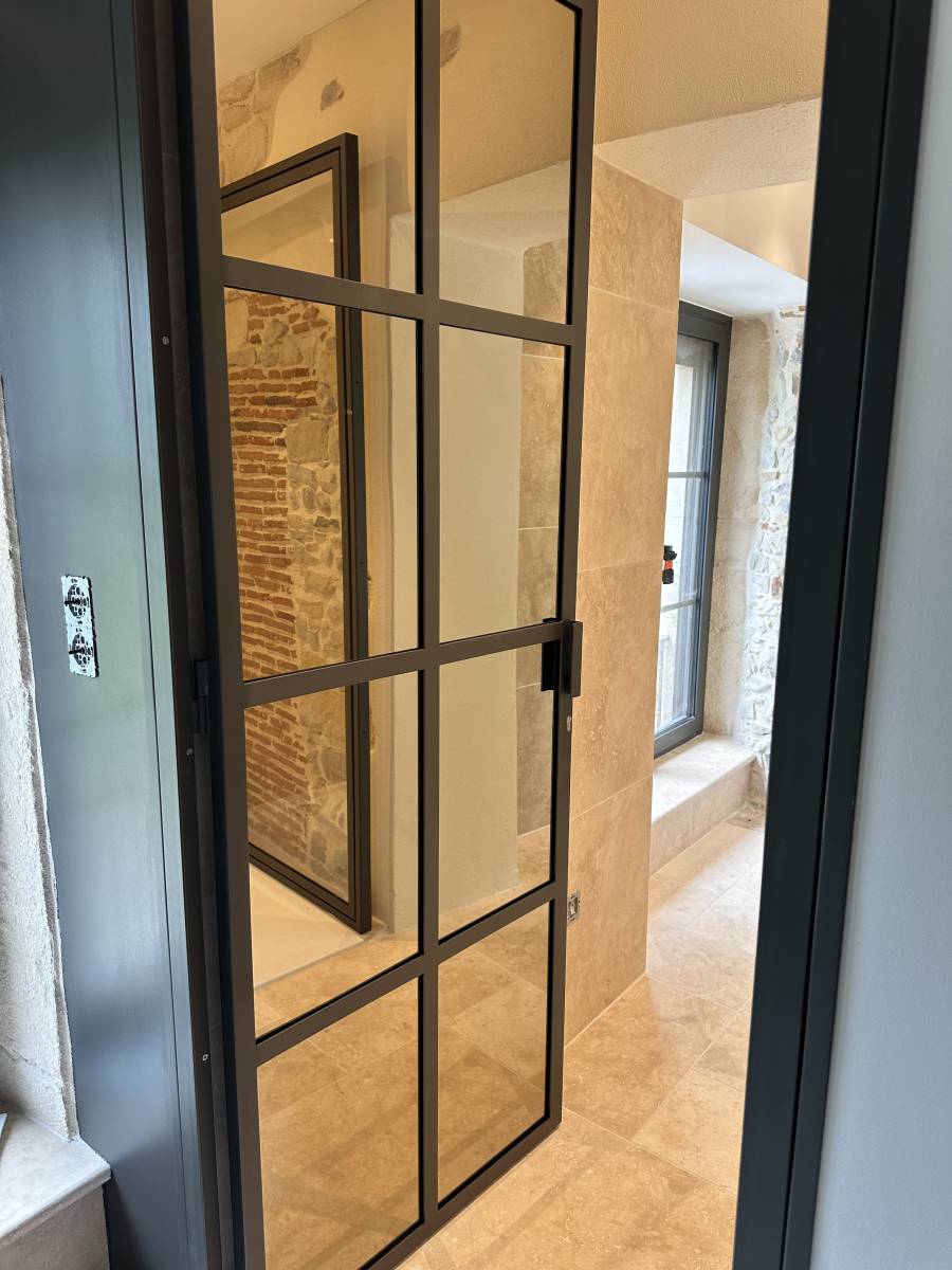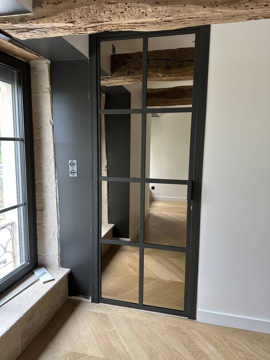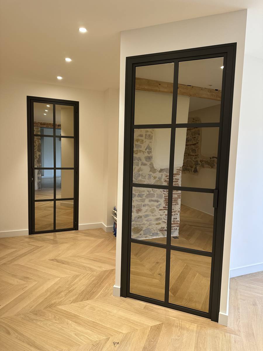 Cette réalisation est une porte verrière en acier sur mesure, fabriquée dans notre atelier à Rochetoirin et installée sur un chantier situé à Bonnefamille proche de Saint Quentin Fallavier. Entièrement conçue pour s’adapter aux dimensions existantes, elle reprend l’esprit atelier avec des profilés fins et élégants.