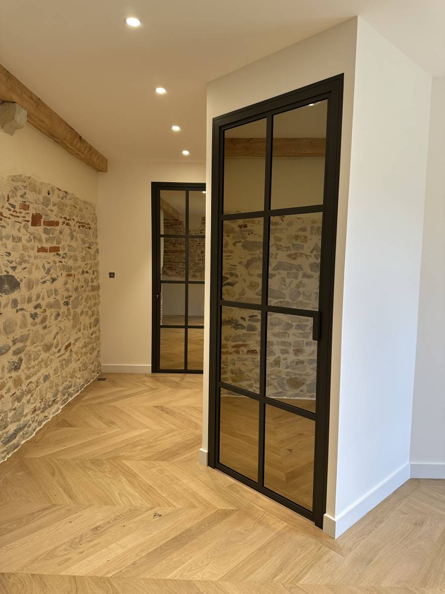 Le style industriel de l’acier se marie ici avec la chaleur du parquet en chevrons et la pierre apparente des murs, créant un ensemble à la fois moderne, lumineux et authentique. Cette verrière sur mesure allie technicité, durabilité et design, en s’intégrant parfaitement à l’architecture intérieure de la maison.