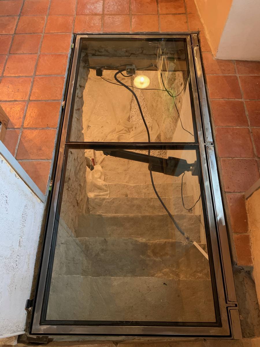 Découvrez dans notre réalisation de trappe de cave motorisée à Bron. Celle-ci a été conçue en acier brut verni avec verre feuilleté trempé. Le moteur active le bras qui permet l'ouverture et la fermeture de la trappe avec une télécommande.