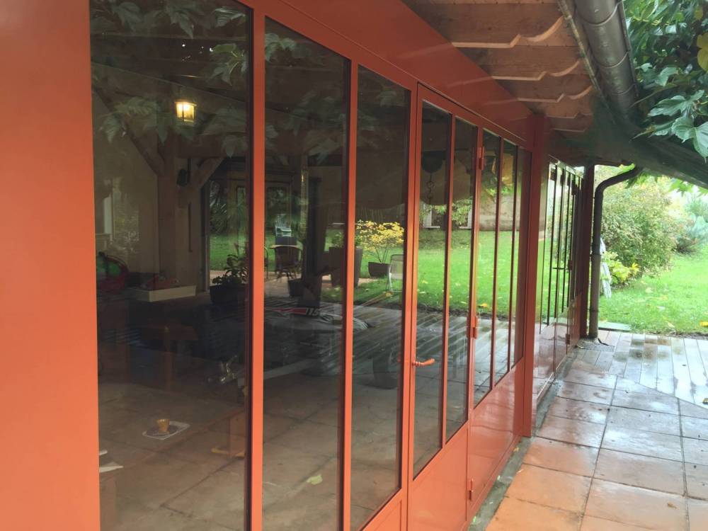 CreAcier lui a proposé la pose d’une véranda acier vitrée de couleur orange afin de faire ressortir au maximum la structure et l’harmoniser avec les éléments naturels extérieurs.