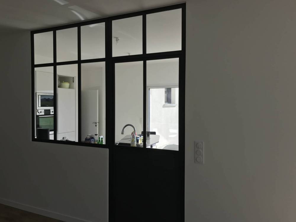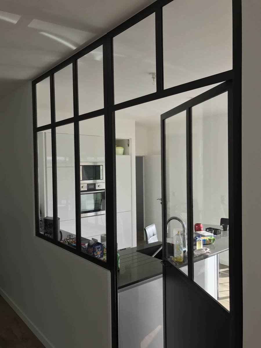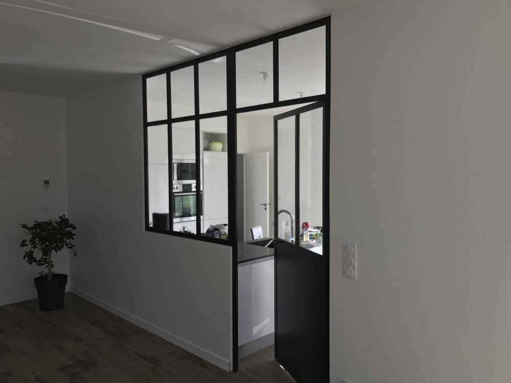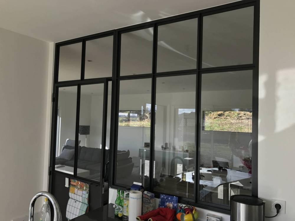 Dans cette habitation nouvelle, CreAcier a proposé au client d’installer une verrière en acier thermolaquée pour isoler sa cuisine du reste de la pièce à vivre. Nous avons procédé à un traitement thermolaqué sur l’ensemble de la structure afin de lui garantir une grande protection et une durée de vie plus longue. Conçue sur mesure, la surface vitrée permet de profiter d’une grande luminosité dans la pièce.