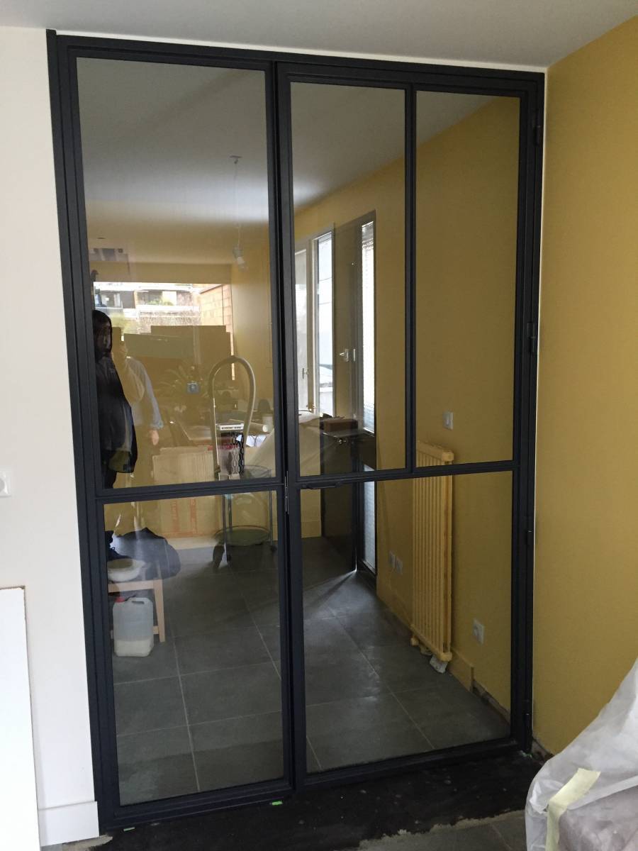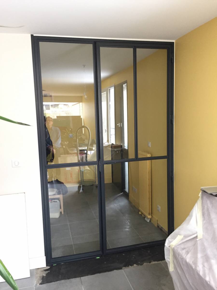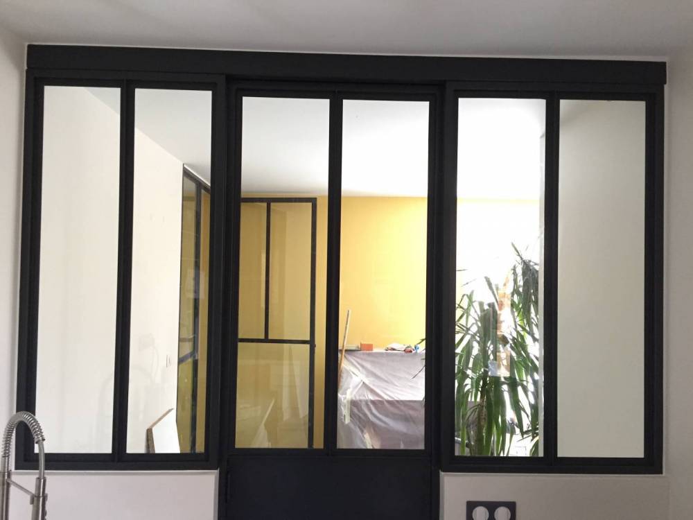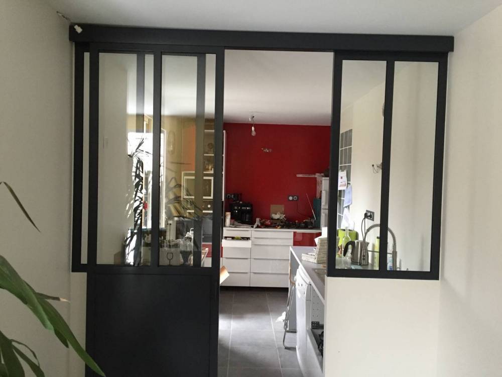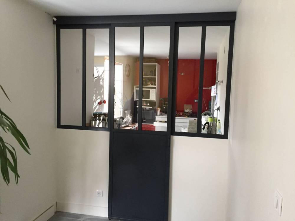 Admirez la finesse de l'acier et la transparence du verre qui donnera à votre espace un plein de lumière naturelle et du caractère à la pièce. La porte coulissante en acier conçu sur mesure, permet d'optimiser l'espace de façon conséquente.
