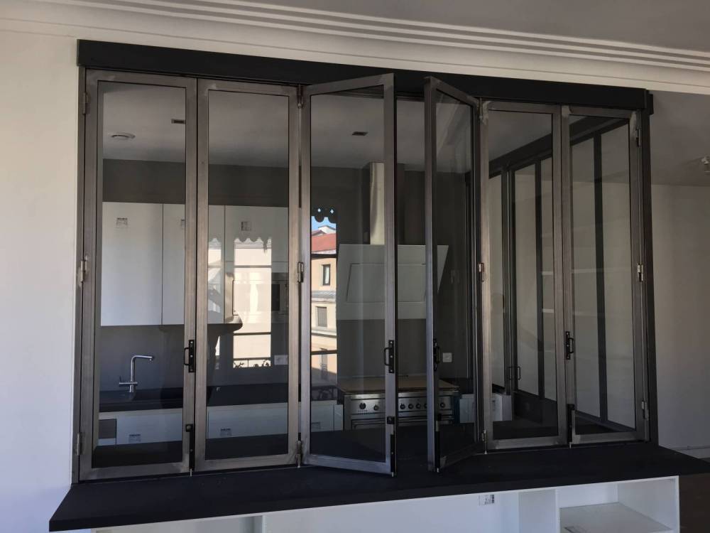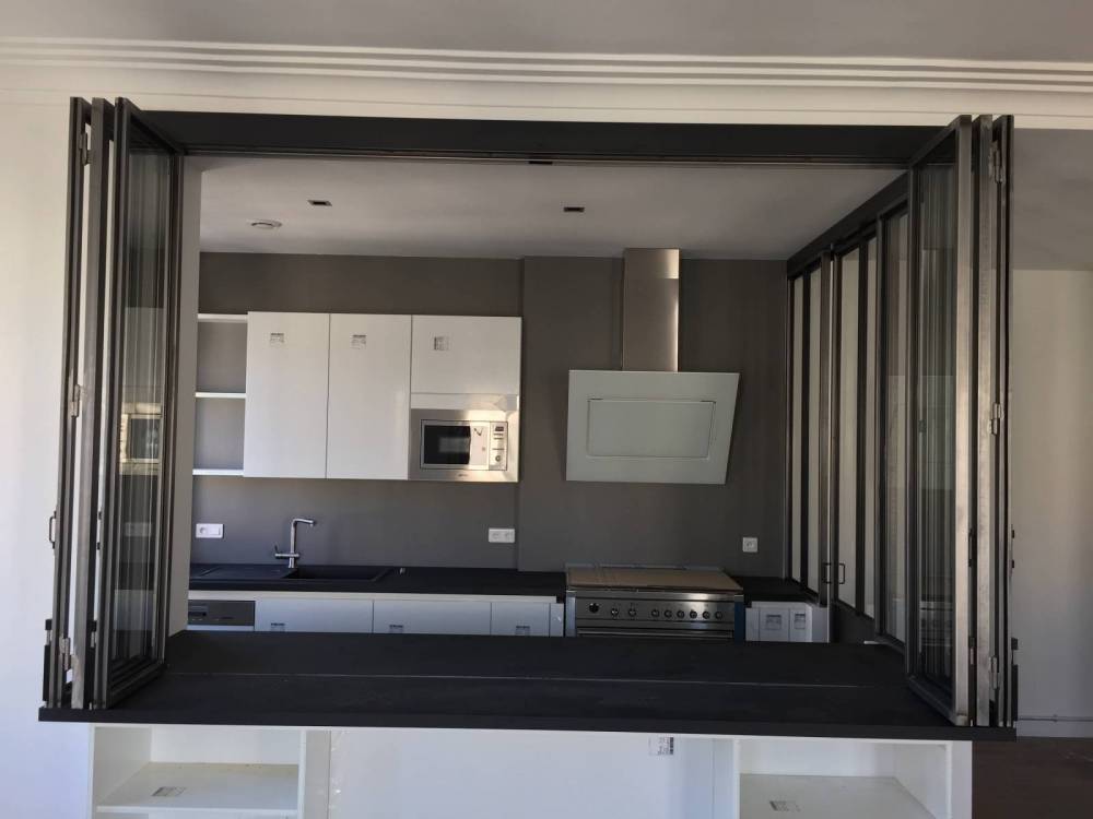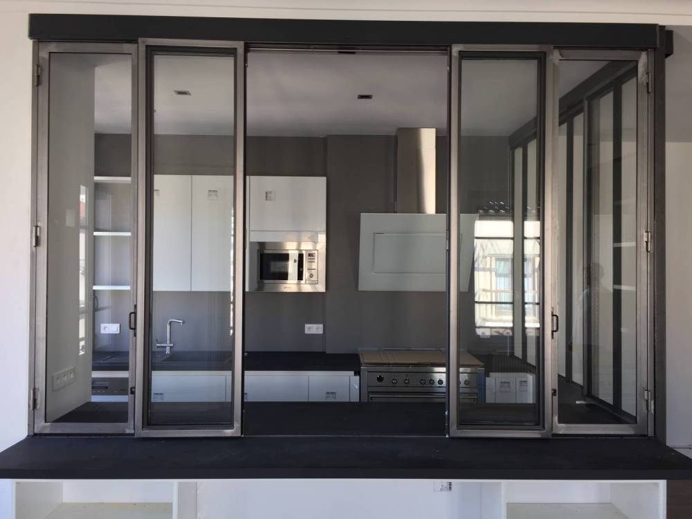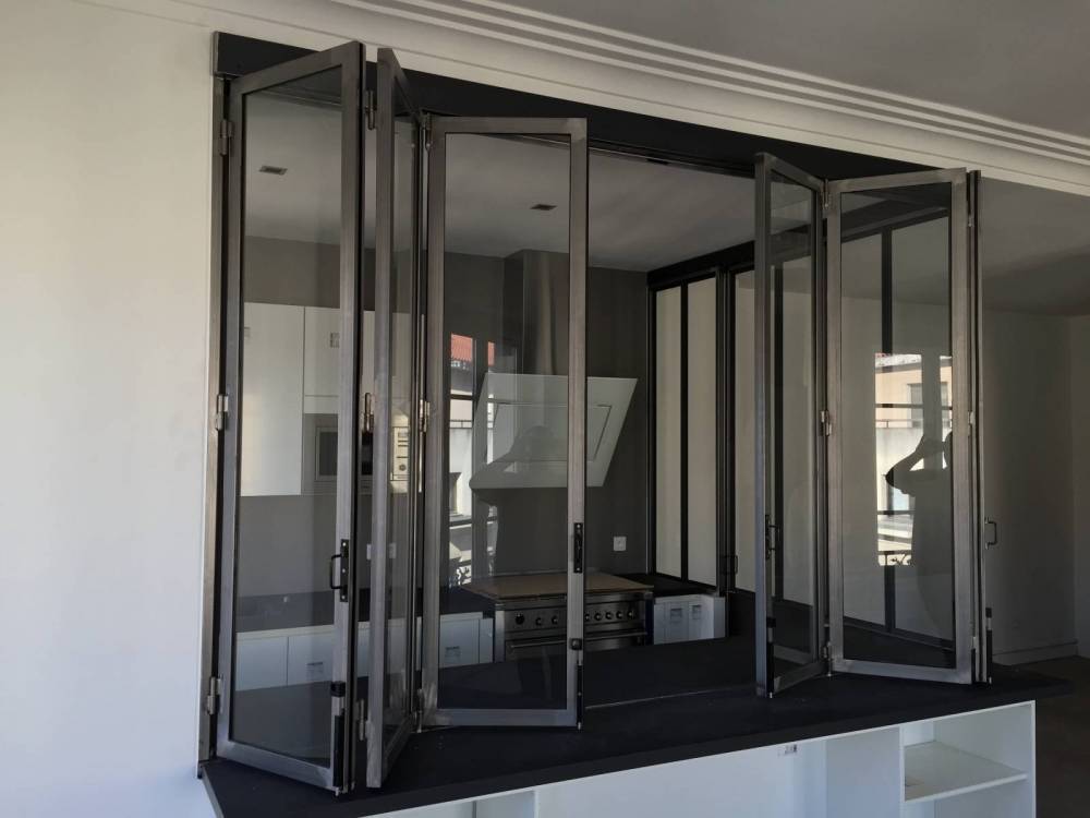 Très pratique d'utilisation, les portes en acier coulissent les unes sur les autres pour se replier en accordéon. Afin d'optimiser au maximum la verrière en accordéon ou encore la porte pliante en verre, nous pouvons mettre en place un plan de travail communicant entre les deux parties de la pièce afin de profiter de vos repas en face à face avec vos convives.