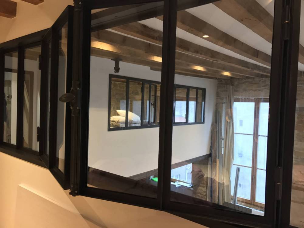 Pour ce superbe loft situé dans les rues moyenâgeuses de Lyon, le client souhaitait isoler la partie couchage de son appartement située en hauteur. CreAcier lui a proposé d’installer une verrière en acier avec double ouverture, conçu sur mesure.