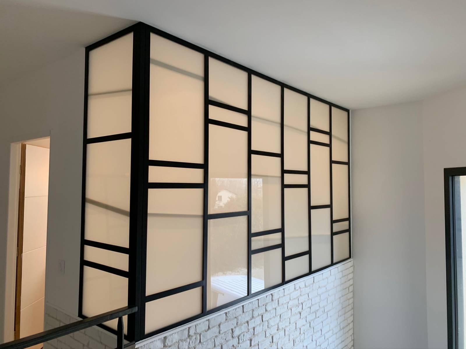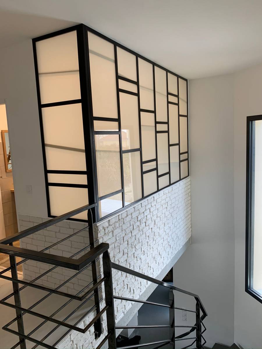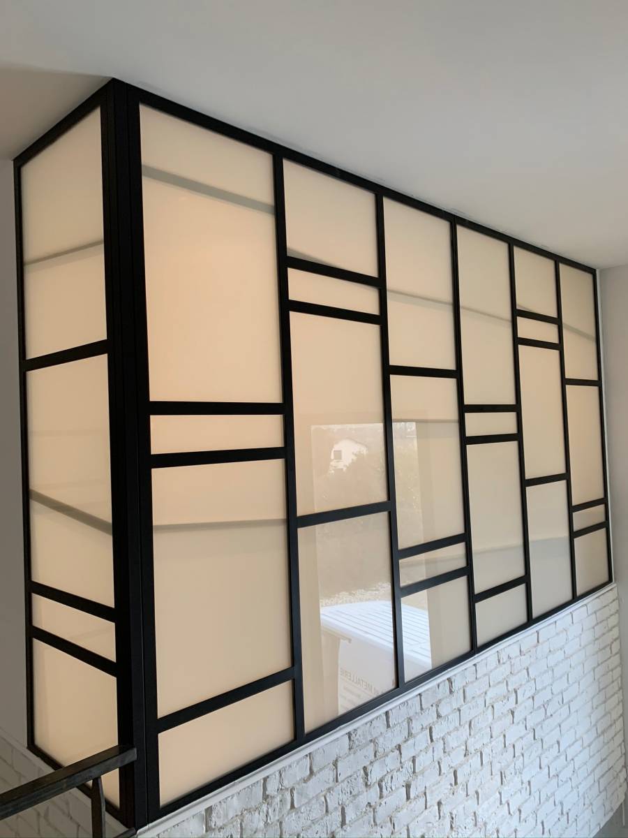 Pour cette réalisation le client a opté pour l'utilisation d'un verre opaque 33.2, pour créer de la luminosité en conservant l'intimité de la salle de bain. La structure est réalisée d'acier traditionnel avec des tés et fer plat de 35mm.