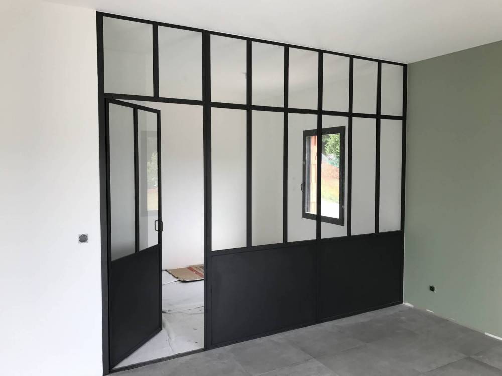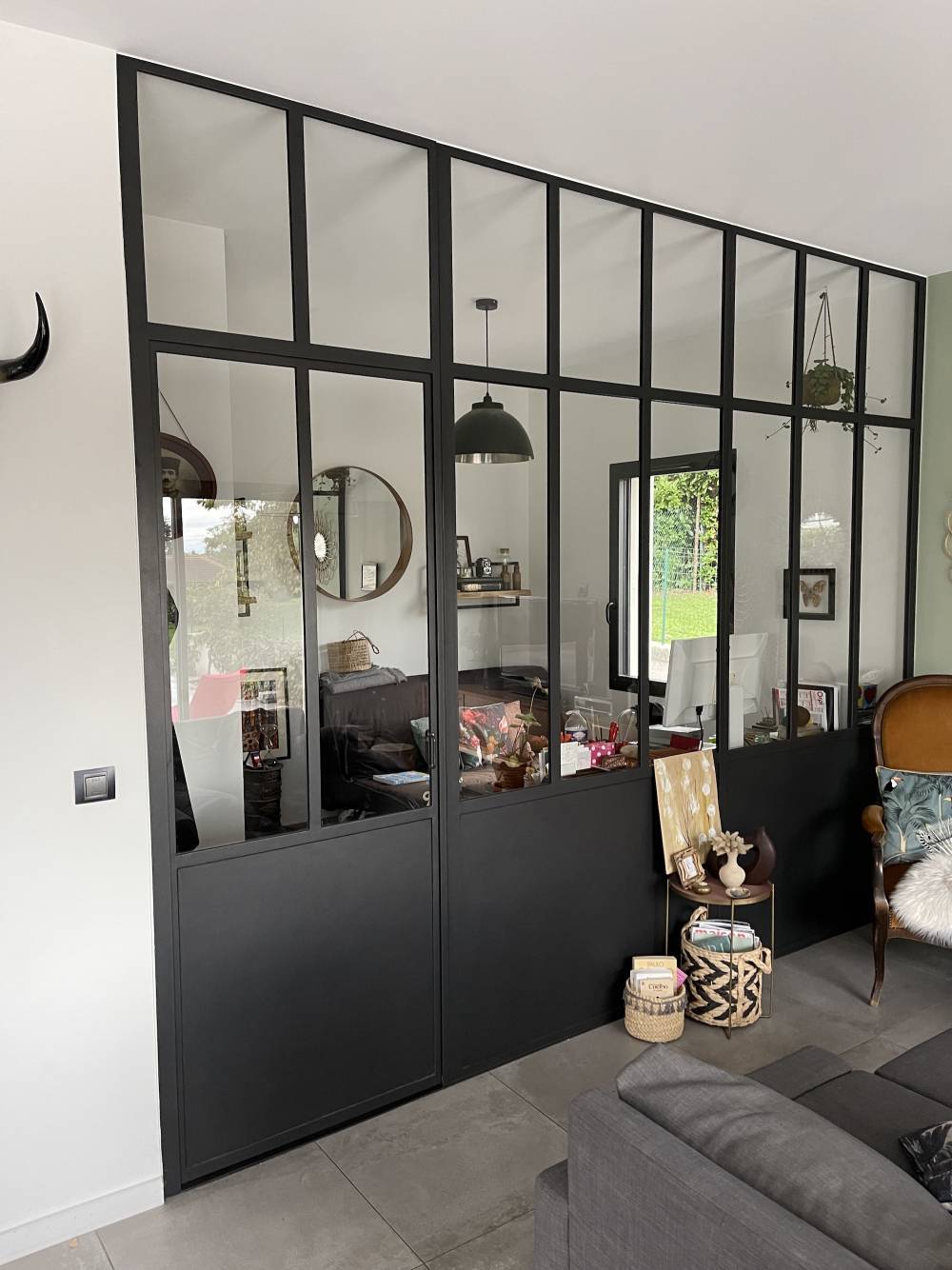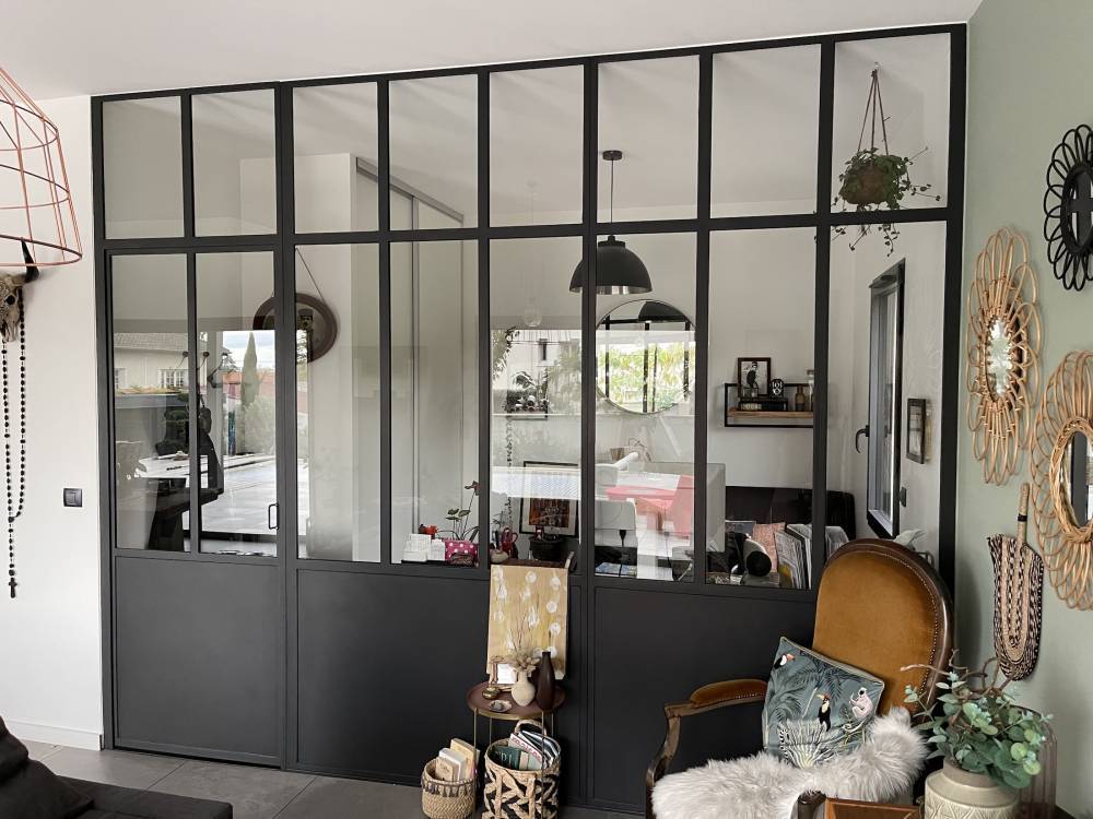 Sur ce chantier à Beynost, le client avait pour envie de séparer son bureau du séjour avec une grande structure laissant traverser la lumière dans l’ensemble de l’espace. Pour lui permettre d’être au calme dans son bureau, CreAcier lui a proposé d’installer une verrière en acier à ouverture simple vantail, conçu sur mesure, répondant à toutes les problématiques posées. Cette verrière en acier est thermo laqué au four avec une finition 2100 sablé.