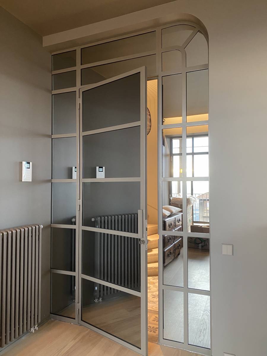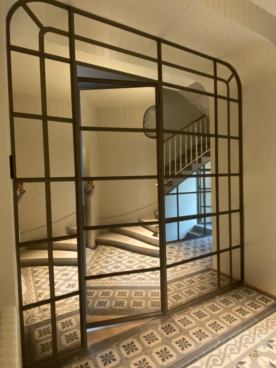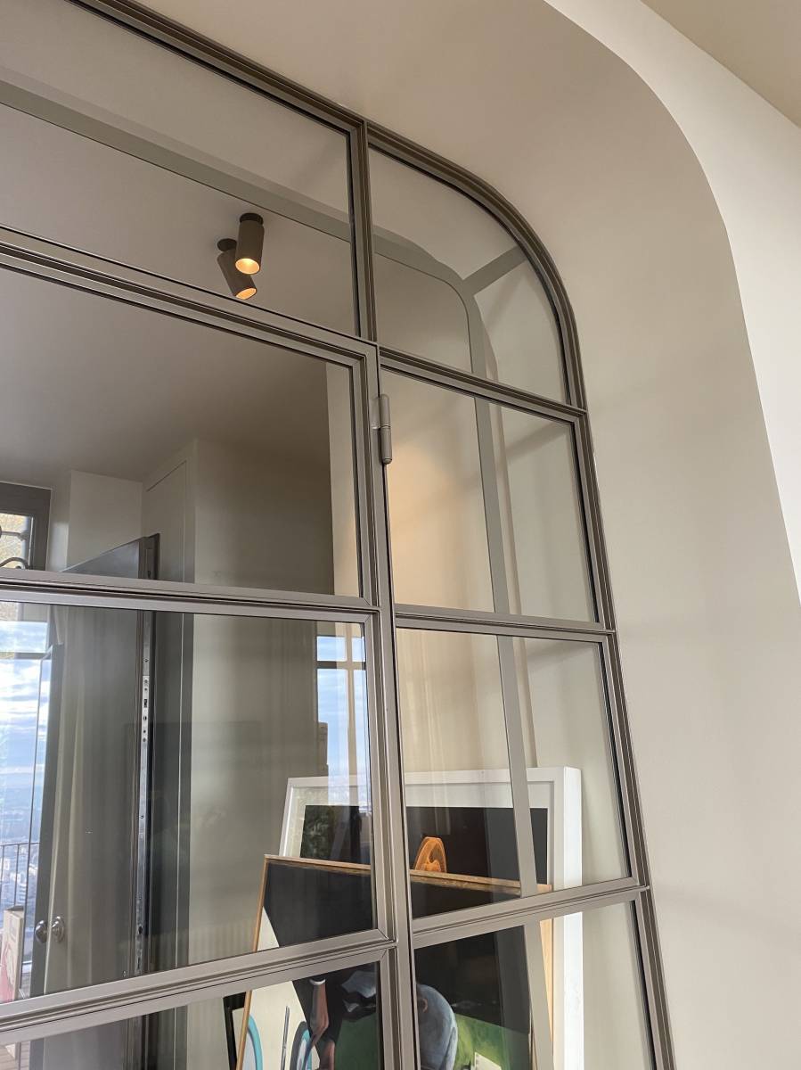 Verrière avec vitrage miroir pour une chambre : idéale pour préserver l’intimité tout en ajoutant un effet de profondeur et de luminosité à la pièce.