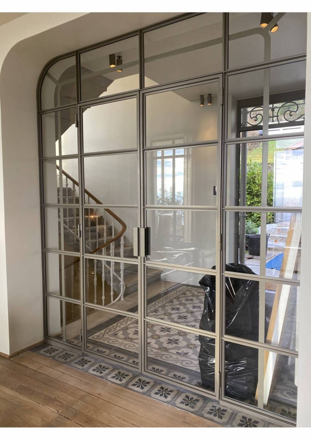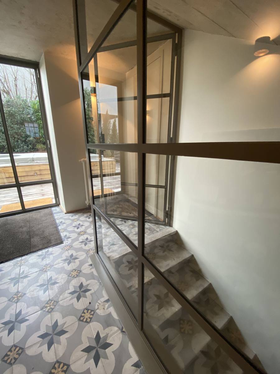 Verrière transparente entre entrée et salon : cette cloison vitrée permet de structurer l’espace tout en conservant une belle circulation de lumière naturelle.