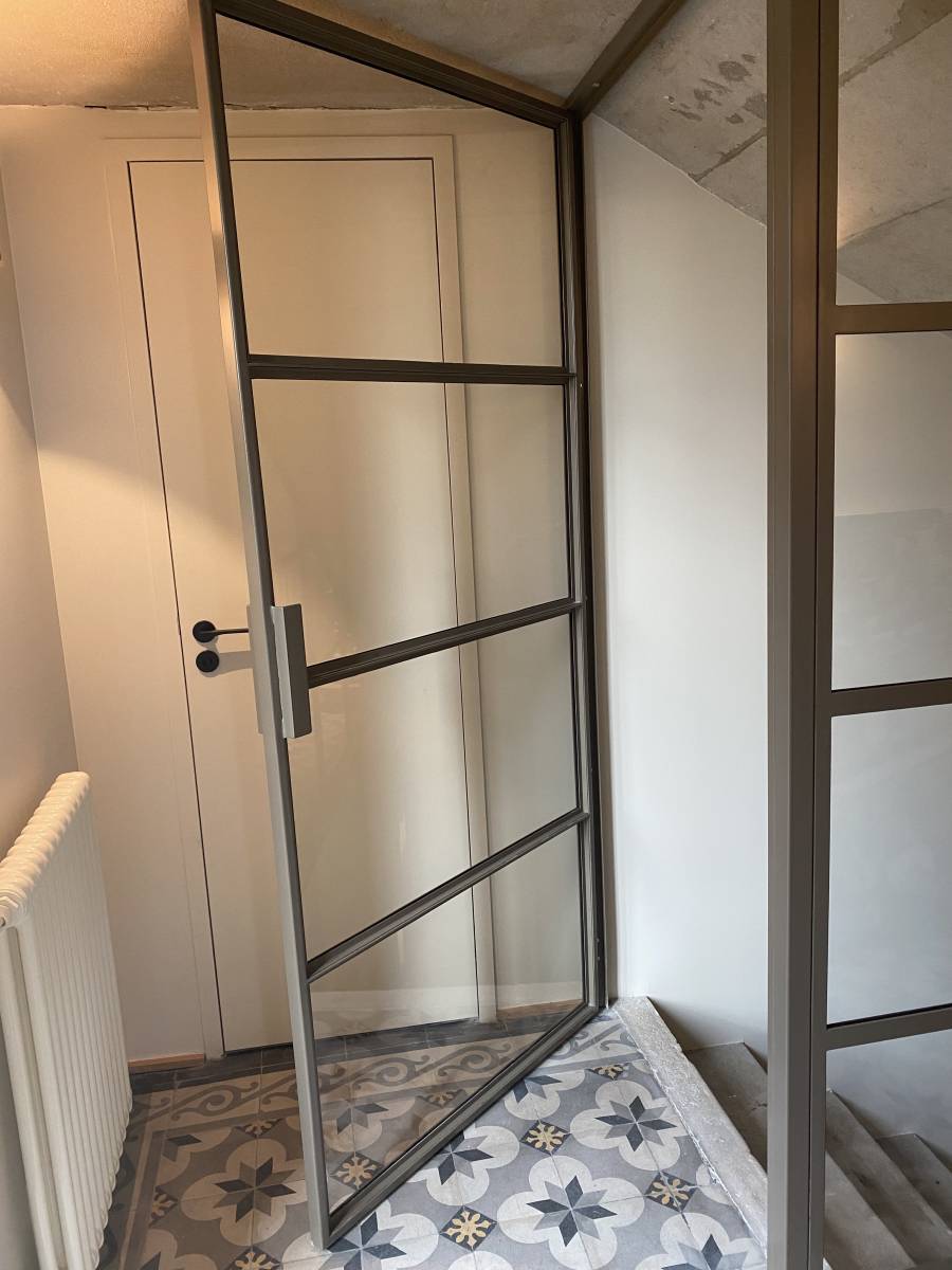 Verrière triangulaire avec porte vitrée : une solution originale et esthétique pour accéder à des chambres sous pente ou dans des configurations atypiques.