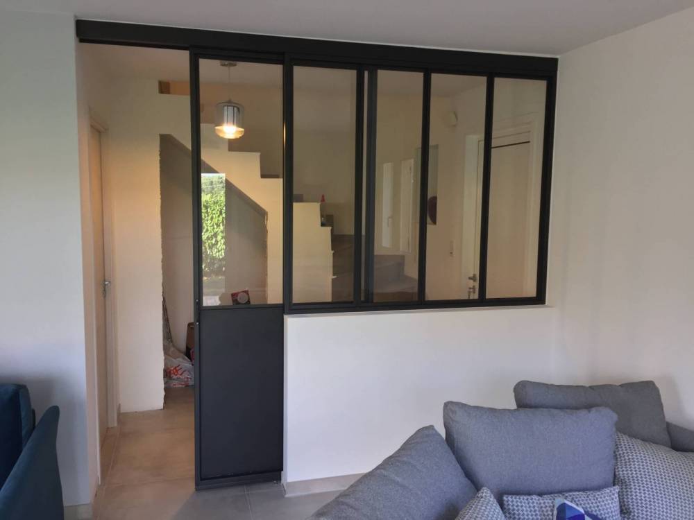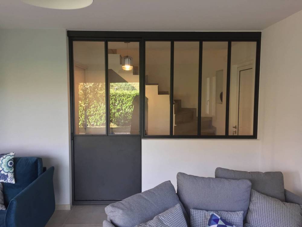 La première permet de séparer la cuisine de la pièce à vivre, et la seconde d’isoler l’entrée du salon. En accord avec le client, nous avons conçu sur mesure une verrière intérieure en acier avec une porte à simple ventail, afin de séparer la cuisine du salon. Nous avons également installé, entre l’entrée et l’espace de vie, une verrière intérieure en acier avec une porte coulissante, afin d’optimiser le passage et garantir un apport de lumière suffisant dans la partie entrée.