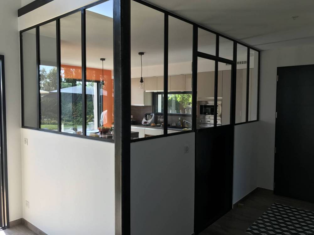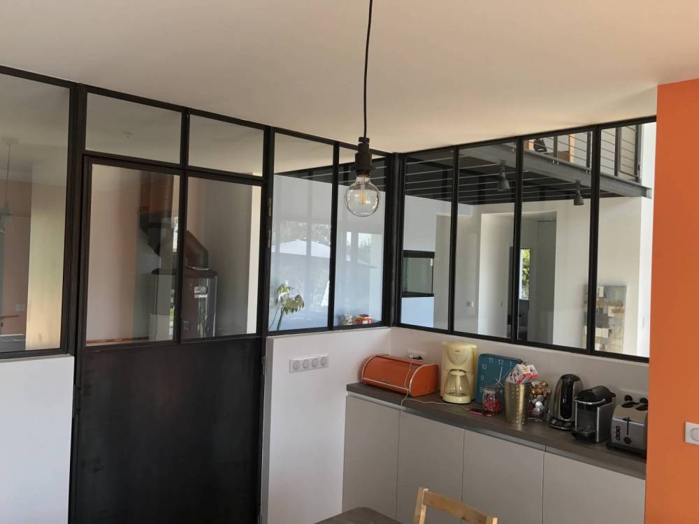 Creacier est intervenu dans cette maison neuve dans la conception et installation d'une verrière intérieure en acier pour la séparation d'une cuisine et une mezzanine métallique.