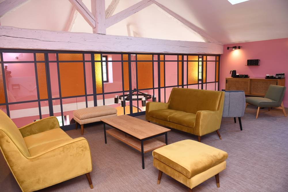 associé à du vitrage martelé jaune, qui apporte une touche d’originalité et de chaleur à l’espace.